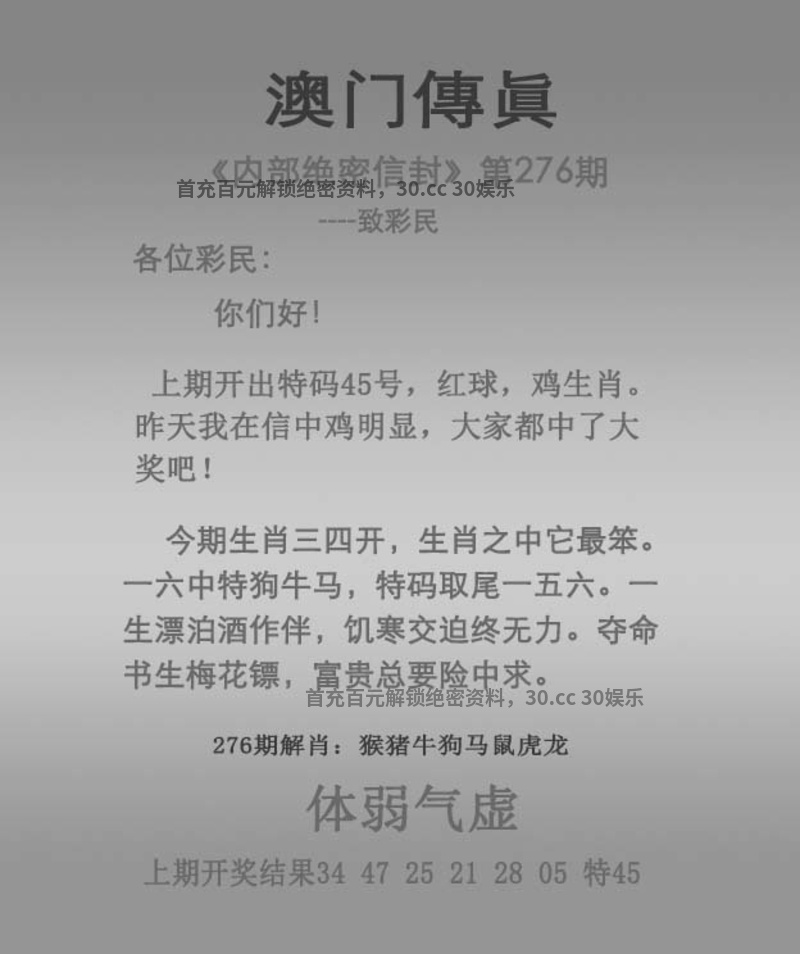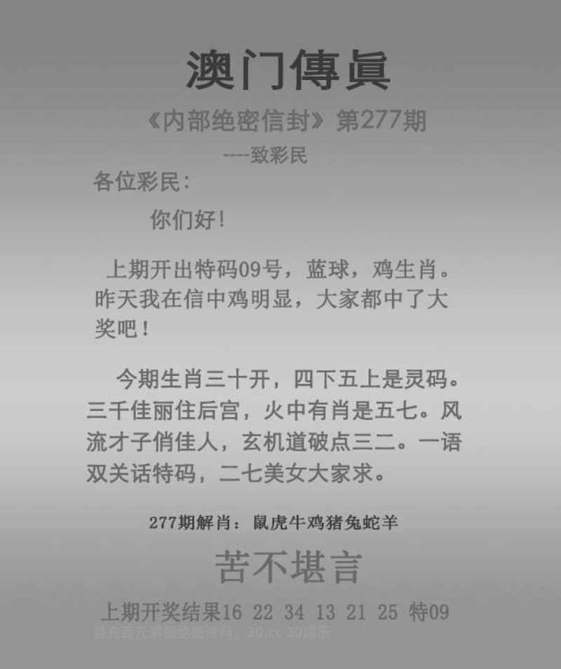 277期澳门传真:今期生肖三十开,四下五上是灵码。三千佳丽住后宫,火中有肖是五七。风流才子俏佳人,玄机道破点三二。一语双关话特码,二七美女大家求。